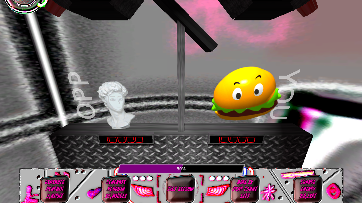 Take turns controlling the Penguin Generator Device to drop penguins on your opponents head. Whoever's health counter (red number under each player) goes below zero first loses. The player with health remaining wins.